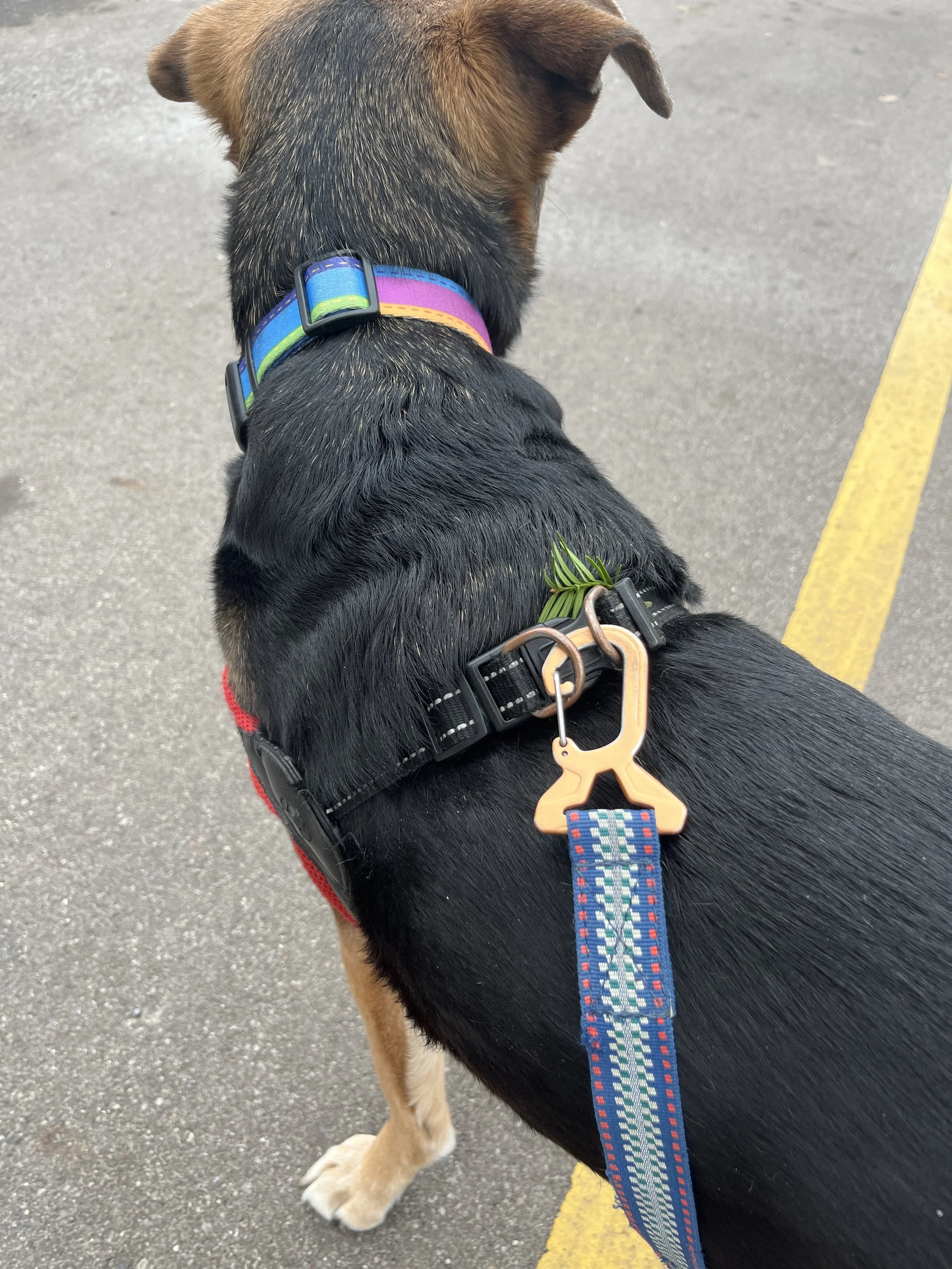 When we are out on a walk and pass any sort of evergreen shrubbery, my dog will lean into it and enthusiastically scratch her back on its brush. She'll make a few passes, hitting both sides of her coat, occasionally getting strung up on a branch. Once she is satisfied and trots off, there will inevitably be a jaunty green sprig or two sticking out of her harness like a corsage. I love it so much I sometimes just leave it there for the rest of our walk.