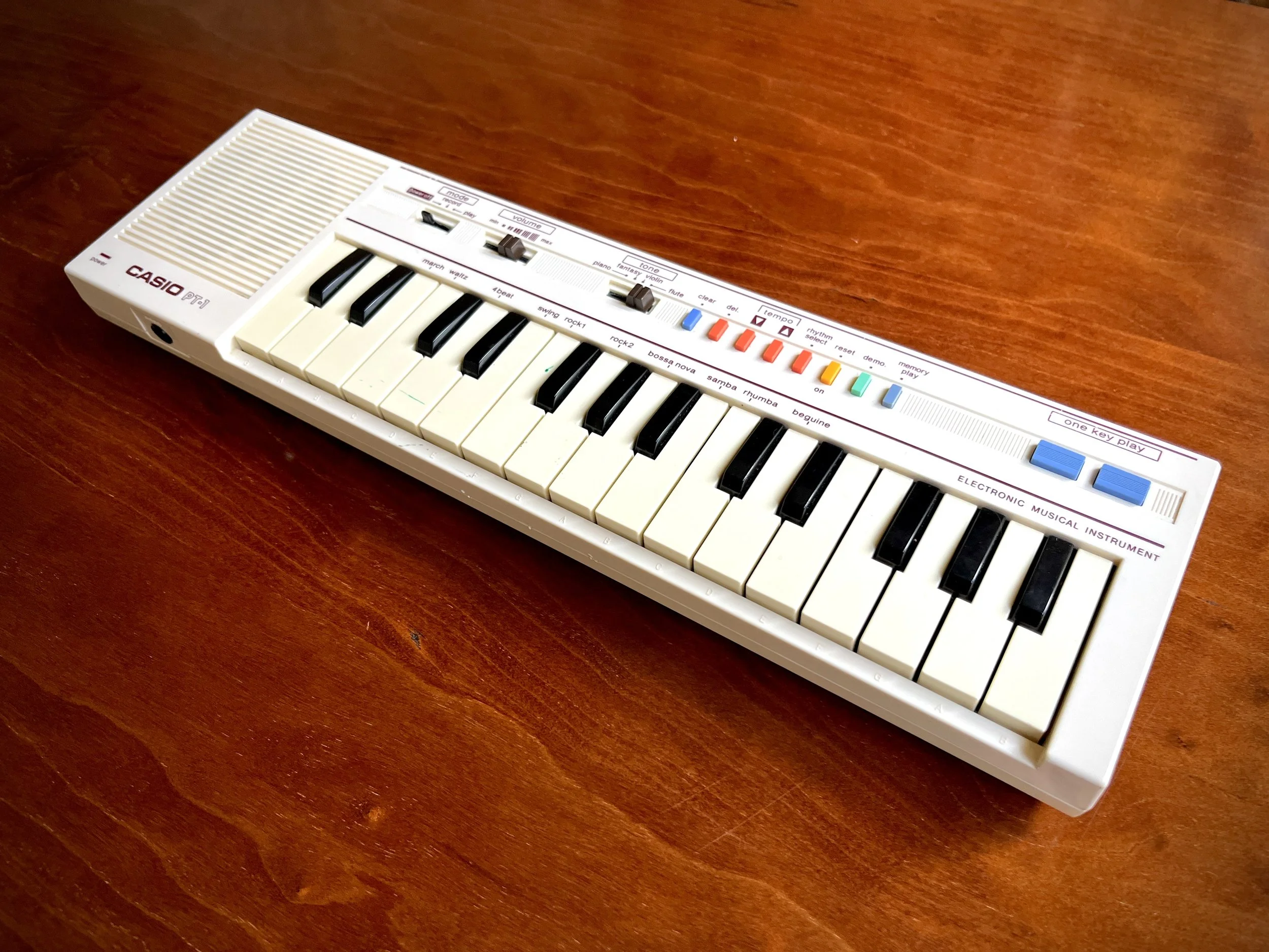 In the afternoon, Nick appears at my back door bearing the most miraculous gift. "Hello sir," he exclaims, then holds out a white Riva flute case. Inside it is a vintage Casio PT-1, a 13" wonder of monophonic 8-bit joy. Like many kids in the '80s, this was my first keyboard.