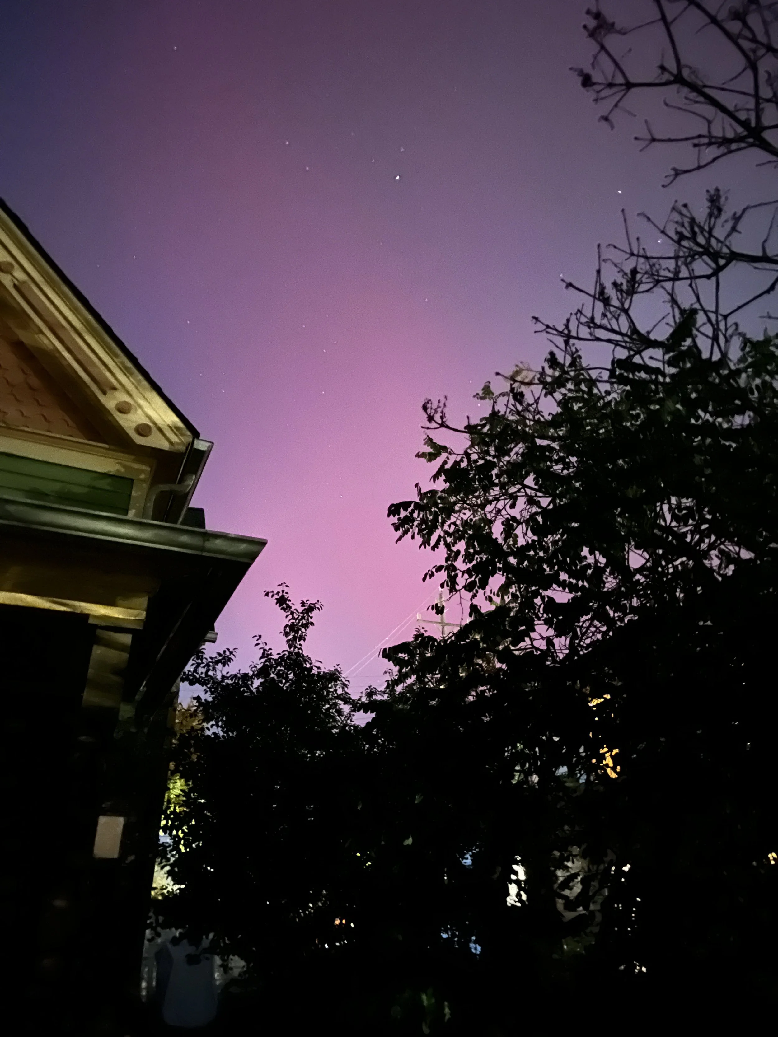 I'm standing at the end of my block looking up at the northern lights for the second time this year. Even in the city with streetlights on either side, the sky has a sweet rosy hue. A lilac tree on the other side of the fence is back in bloom which feels ecologically foreboding. A car pulls up and a guy in a baseball cap walks back and forth, checking addresses before walking up onto a neighbor’s porch. The door opens and he enters to a raucous chorus of "nooooooo!!!!" For a split second I remember what it was like to be in my 20s.