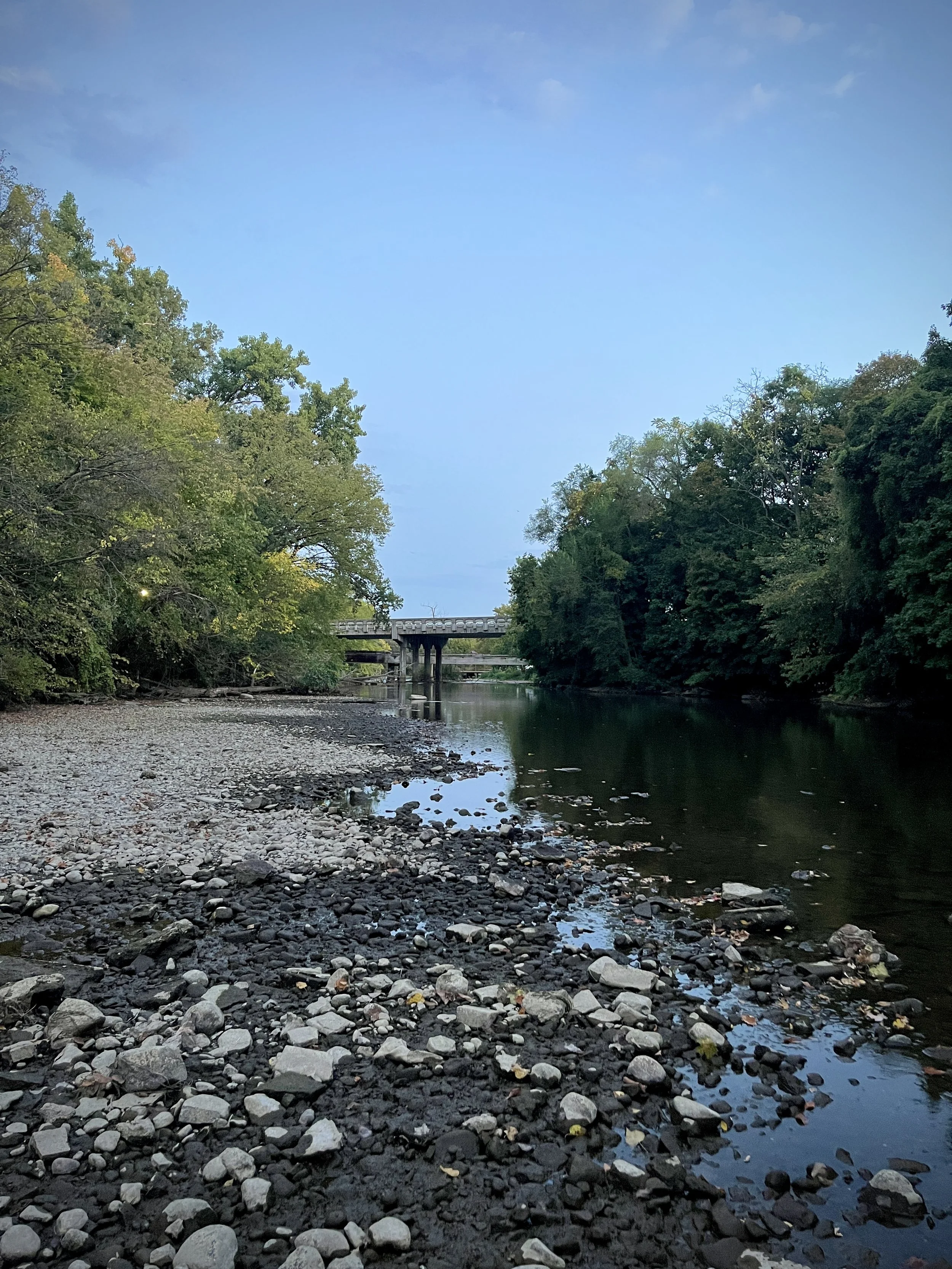 T.G.I.F. It’s been a long week. I walk back through Frog Island after meeting my brother and Jenny for beers at Andy’s bar. I've never seen the Huron this low. I walk over the rocks to what should be mid-river and take a photo of the Cross Street bridge from a perspective I've only ever seen by kayak. I scramble back up the bank and look down the other side at a man riding no-handed laps on his bicycle around the park's dirt track.